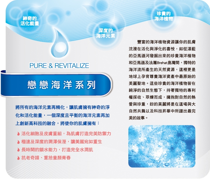 能鎖住大量水分子,令肌膚高度保濕潤滑,並在角質層上形成一道薄膜,直接補充細胞所需之營養。內含小分子玻尿酸對肌膚的滲透力極佳,能很快的達到肌膚底層,進行較深層的水.....